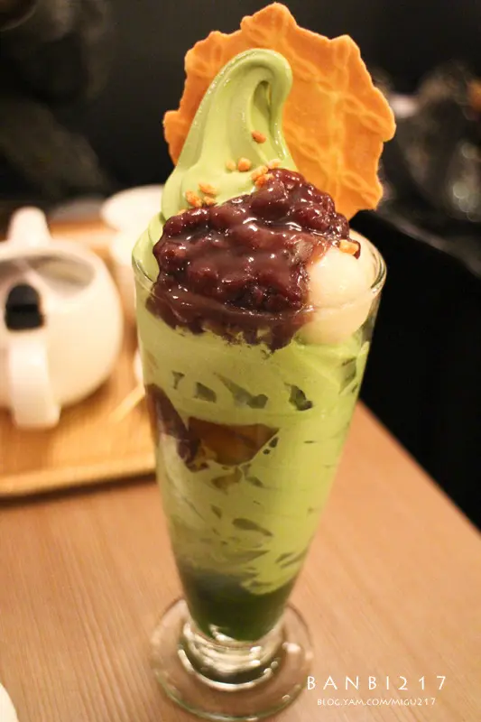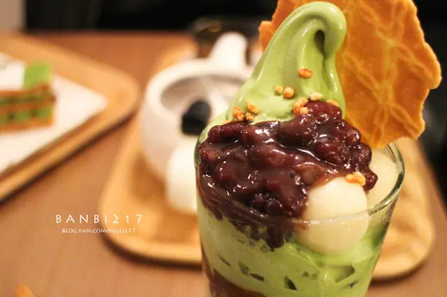 濃郁的宇治抹茶冰淇淋富有豐富的茶香與細緻口感和廉價的人工抹茶香精是無法比擬的。這樣好吃的抹茶冰淇淋搭配上QQ又帶點脆度的寒天凍、綿密飽滿的紅豆沙、Q彈的白玉湯圓以及法蘭蘇餅乾脆片,這樣多層次的色澤與味道及口感,在舌尖享受這些衝擊時又嚐到米香脆口的玄米顆粒!
