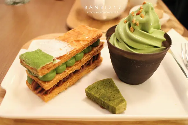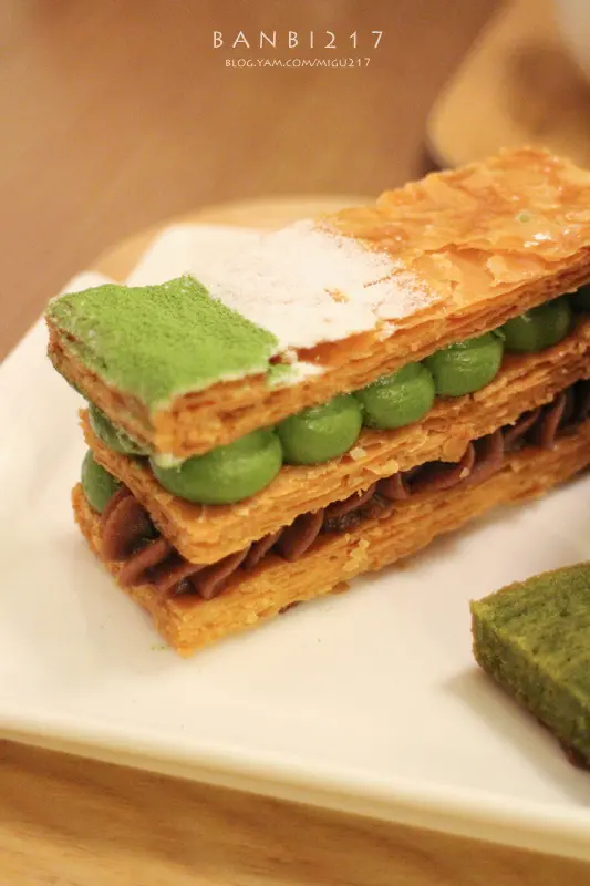 和風抹茶千層派:日式與法式甜點的完美結合,抹茶與千層派結合既美麗又不衝突,外觀上漂亮的讓人捨不得吃它的一品甜點。