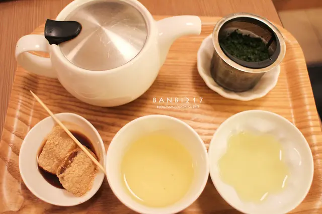 附上好吃的蕨餅,搭配輕柔細緻的黃豆粉和自製黑糖蜜,黃豆粉與黑糖蜜的香味結合的恰到好處加上咬起來「ㄉㄨㄞ、ㄉㄨㄞ」的口感,真是配茶的好點心來著!這暖和身心的熱茶還可以回沖唷!