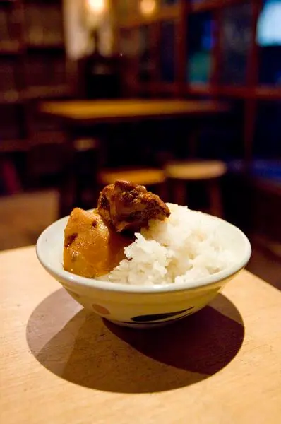 偏瘦的豬五花及菇類薄片,在醬油主導下還有某種若隱若現的酸香。