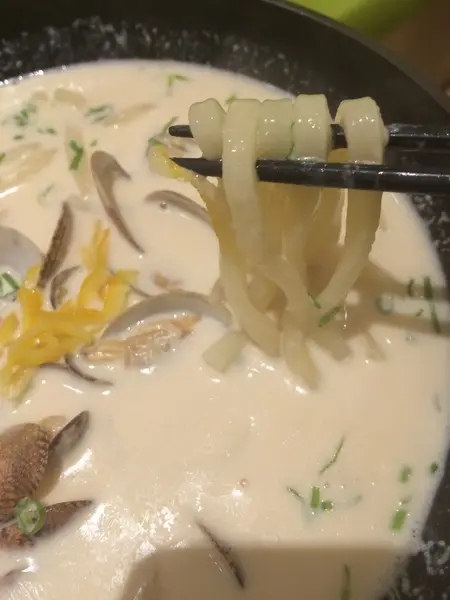 烏龍麵條附著濃郁的奶油湯頭,麵條具有口感與咬勁,