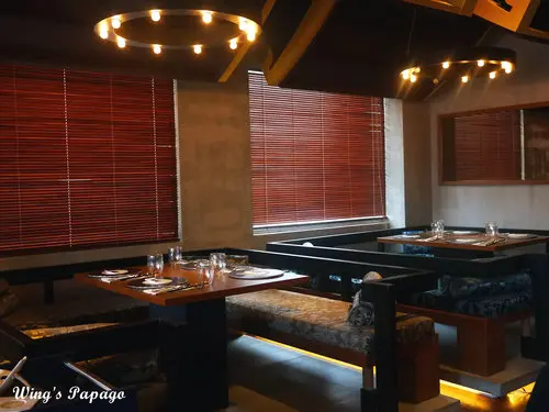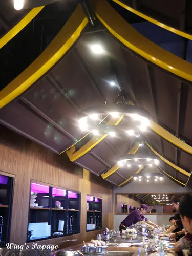 ※平日中午客人人數尚可,我們坐在長型大料理檯的最左端,從這位置望去天花板的裝潢好有特色又好有氣派喔,室內則因有大片落地窗緣故,採光很明亮。