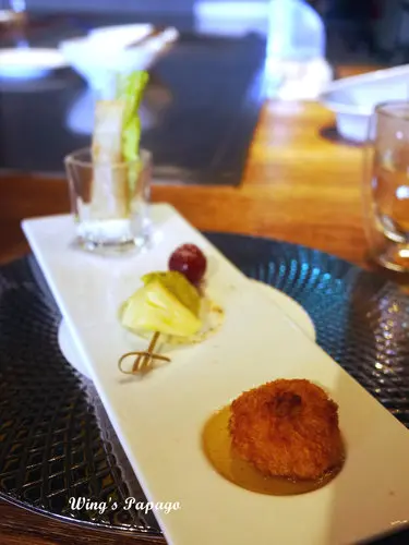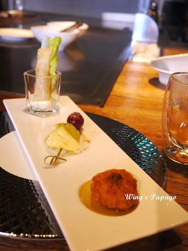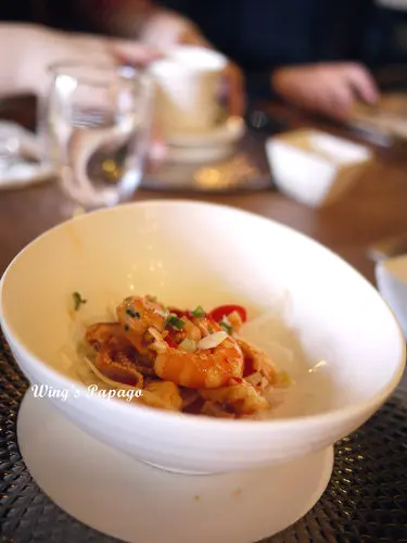 ※開胃菜金錢蝦球+泰式鮭魚卷,服務人員建議先吃中間的水果串,水果串鮮甜,灑上椒鹽提味也很搭。泰式鮭魚卷是春卷皮裹住鮭魚皮油炸的,外酥內嫩趁熱配蔬菜吃更爽口。