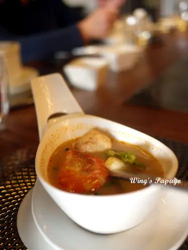 ※開胃菜後是湯品,maggie選了泰式酸辣蝦丸湯,酸辣湯向來是泰式料理的招牌湯品,而我選的香茅南薑雞湯,雞湯夠熱調味也很清爽,帶有濃濃香茅特殊香氣加上南薑提味,很暖胃的一道湯品。
