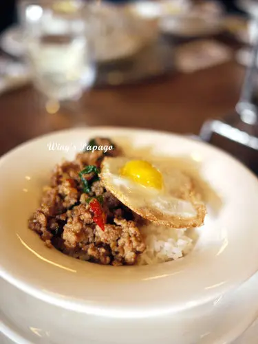 ※太陽蛋打拋豬飯,白飯上放上炒過的打拋豬肉及迷你可愛的太陽蛋,打拋豬調味恰當,配飯吃讓人忍不住一口接一口。※Maggie主餐選泰式三味沙朗牛排,用特製的三層架盛裝三種不同口味的沙朗牛排,顯得特別高級,而且又是多樣化口味的一道餐點。