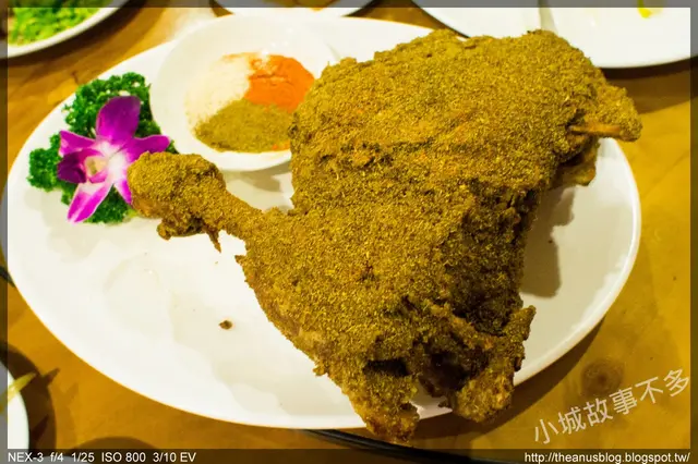 切完之後端上桌,印入眼簾的沾粉分別是孜然粉、胡椒鹽和辣椒粉,我三個都沾完後,覺得辣椒粉算是最特殊的吧,因為根本就不會辣,取而代之的是濃厚的香料味,建議一定要三種輪流沾著吃,因為雖然烤羊肉很好吃,羊騷味很夠味,但假如沒有這些調味料來提味,吃到第四塊就開始覺得膩了~