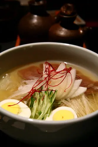 韓式冷麵,以大量牛肉熬製的湯底,加上水梨絲、黃瓜絲、白煮蛋等等,麵條是細蕎麥麵,QQ而爽口,牛肉湯冰涼地喝卻意外不膩喔~~