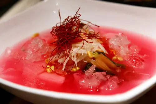 很特別的泡菜冷湯,這是加了紫高麗去泡而成就的粉紅色,酸鹹的風味,淡雅而爽口,吃完油膩的烤肉來一分特別清新~~
