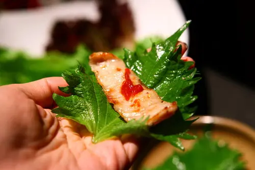 紫蘇葉包豬松阪超讚!!紫蘇的香味和豬松阪的油香在口中取得很微妙的平衡,軟嫩而不油膩!!