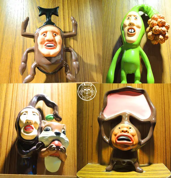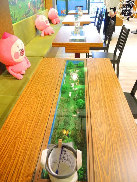 餐廳內部就像來到叢林內,靠牆的櫃子內有很多醜比頭情境公仔