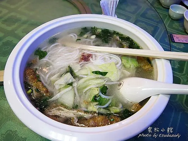 「過橋米線」我們上桌時是已經幫我們把料都拌好。米線以雞湯為底,原本在碗底應該先抹上雞油,但目前沒有這麼做啦~畢竟太油了!裡面的料有菜、炸豆皮、肉片及云腿(又稱宣威火腿)。我曾經在云滇吃過一次過橋米線,但與這回品嚐起來口味差許多,雞湯不油清澈但湯底味道十足鹹度適中米線很Q不爛很有口感,簡單的配料完成一碗好吃的湯麵,而添加云腿是將的油帶入湯中帶出甜味比加入肥豬肉效果更好。