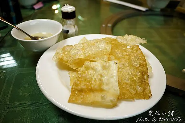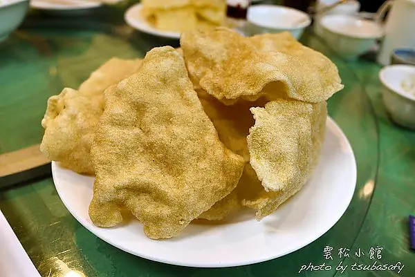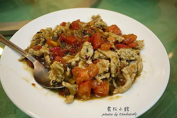「雲南大薄片」切薄片的豬頭皮底下鋪著一層切絲的小黃瓜,吃的時候不要只輕輕的在沾醬上層沾過,要浸到底部否則只會吃到上層的辣油而吃不到酸味。以往在餐廳點的雲南大薄片底部是鋪著高麗菜絲,醬汁及香菜等配料大多都已經淋在肉片上,吃起來就是辣酸分明,但是雲松小館的大薄片肉質吃起來脆有口感,沾醬辣味及酸味感覺變成親人一般不分彼此,肉片包著小黃瓜沾醬汁更顯得有清新的感覺。