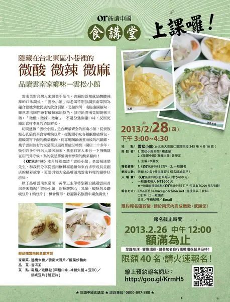 228這天天氣晴,下午到雲松小館參加2月份的食講堂。雲松小館錯落在東區的小巷弄中,在這附近上班的我還真不知道這邊有間道地的雲南餐廳呢!