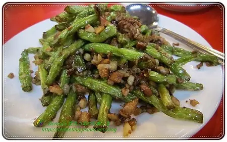 四季豆下鍋小油炸後與豬絞肉拌炒,味道十分下飯四季豆還保有其口感。