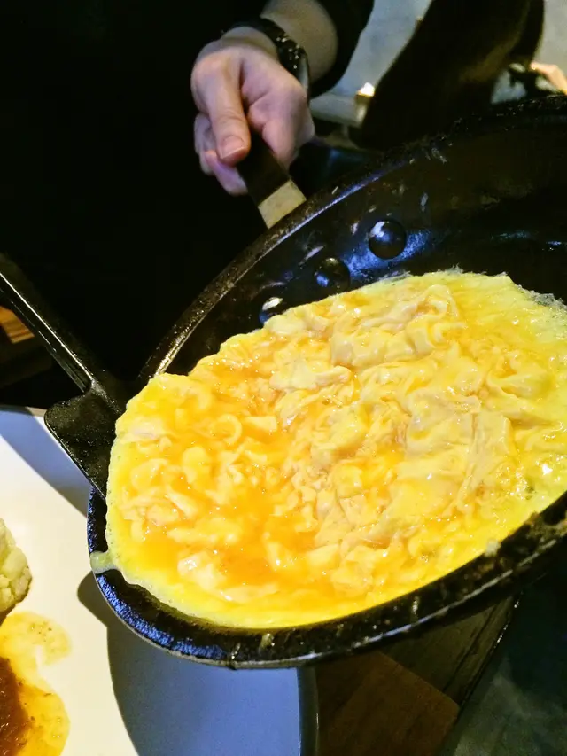 另外加點的歐姆蛋會由廚房裡的人直接走出來把蛋倒盤子上,我最喜歡這種半生不熟的歐姆蛋,可以看到蛋汁還滑溜溜的在蛋皮上,用湯匙挖一口咖哩醬汁與蛋一起入口,特別好吃!