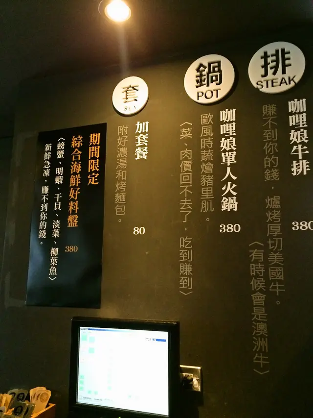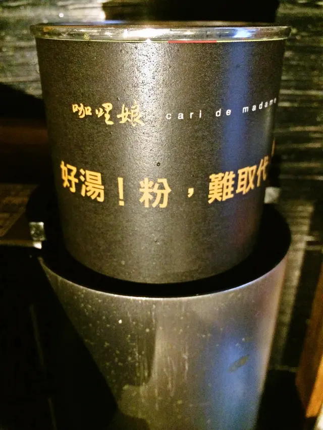 另外有發現[咖哩娘]一個很可愛的地方,就是店裡充滿了各式標語,用很口語的方式呈現menu,連火鍋的卡式爐上也有標語:好湯,粉,難以取代!不斷提醒我們不要一直吃化學香料做成的咖哩,這才是真正的咖哩阿!