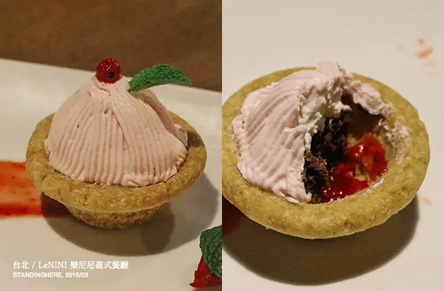 酥鬆的餅乾塔皮裡頭是草莓果醬>巧克力蛋糕>鮮奶油,