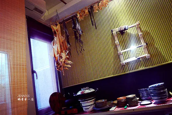 服務人員指引就坐後,眼前是風乾的魚骨,料理用的刀器,臺面上是一疊又一疊陶盤,火爐上正烤著玉米,好特別的場景,充滿著溫度的居家料理氛圍。
