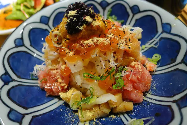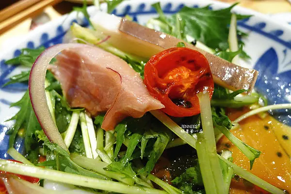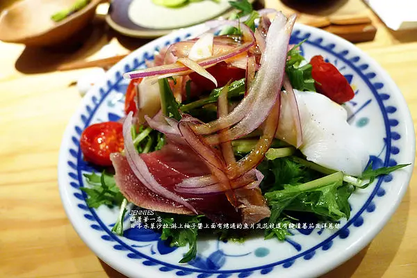 但是我還是好愛!這道日式沙拉有別於外面一般的作法採用日本水菜,咬起來細長分明再淋上酸酸甜甜的柚子醬,跟和風醬有明顯的差異,我更愛這樣的味道,咬嚼在嘴巴裡層次更分明,沙拉裡還有輕烤過的魚片、花枝、蕃茄及洋蔥,第一道就讓我愛上這裡了!