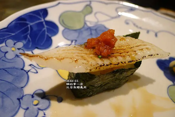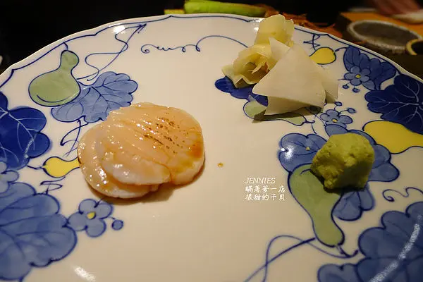 接著是生干貝,師傅稍加炙烤過後淋上一些醬汁,擺盤上的醬瓜及現磨的芥末隨個人喜好搭配。
