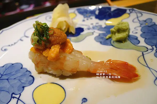 牡丹蝦帶著殼吃蝦頭裡面包的是醋飯,吃這道要小心蝦的刺。烤的香脆的蝦頭包覆著軟軟甜甜的醋飯,真是好吃極了!