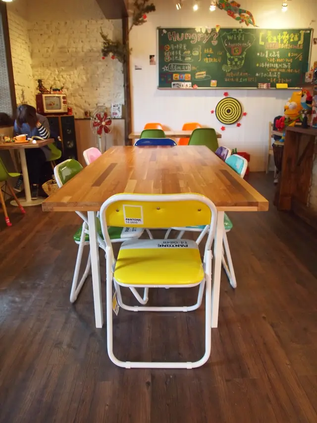 這是進店裡後左手邊的區域,五顏六色的椅子和黑板上的粉筆字相互輝映。