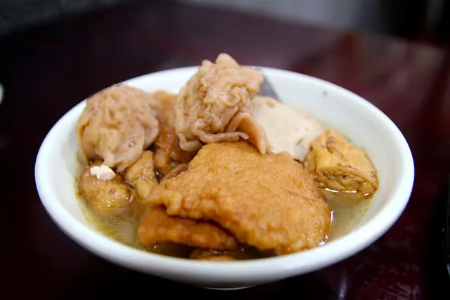 內容有甜不辣條和大片甜不辣再加豆腐、豬血糕、菜項加餛飩
