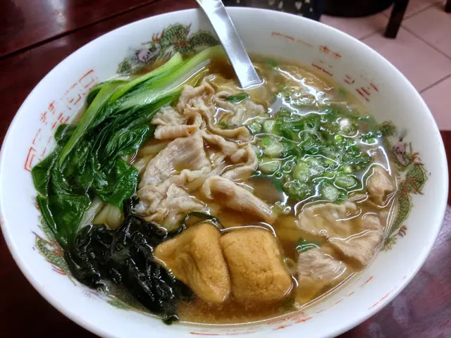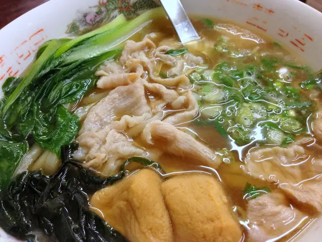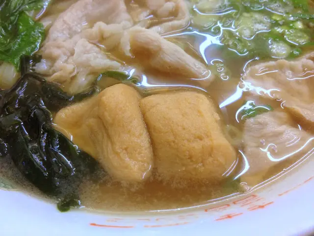 上頭鋪著海帶芽、湯匙菜(青江菜)、洋蔥、小油豆腐