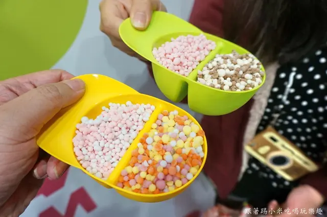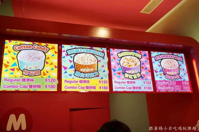 以價格來說真的是不便宜, 單杯120元, 酷炫雙拼帽 180元(就是可以一次吃兩種口味). 口味上有 棉花糖/黑白巧克力/彩虹世界/草莓牛奶 四種, 為了讓大家都能看到四種口味是長的如何, 小米只好忍痛買兩個雙拼了