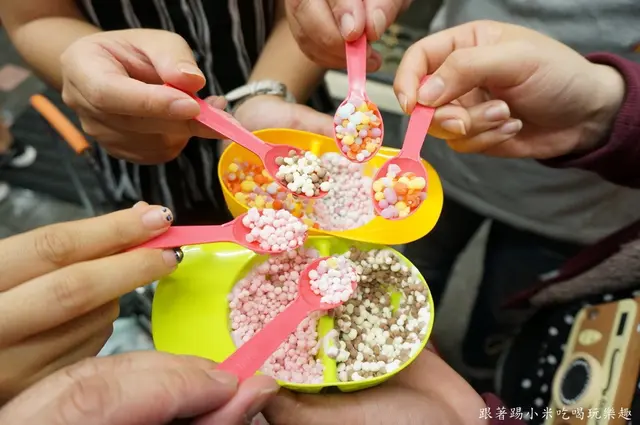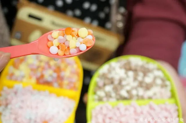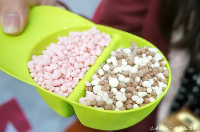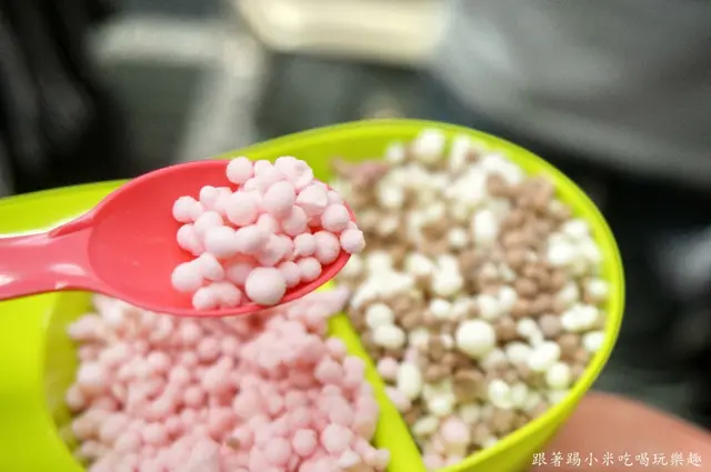 棉花糖, 粉紅色小米吃出應該是草莓味, 藍色真的算小米不才, 吃不太出來是什麼味道, 一樣是牛奶味比較濃郁