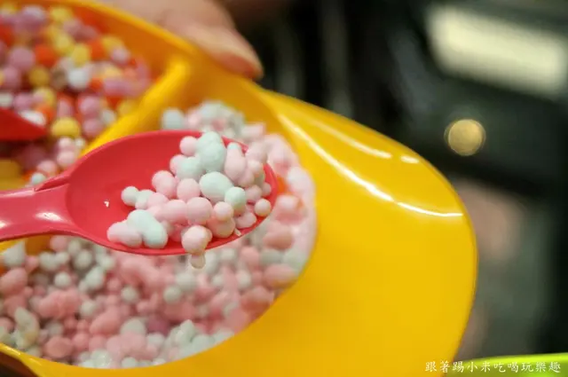 彩虹世界, 造型上是繽紛色彩的夢幻風, 口感是它的特色, 好像在咬冰淇淋粒, 不會想像中是很硬的冰粒, 是一點點軟硬冰淇淋粒口感, 格友貓董說好像在吃保麗龍的顆粒口感咧 口味上是偏酸的水果味, 對小米來說是比較難接受的酸, 跳過~