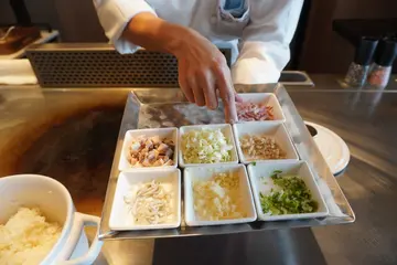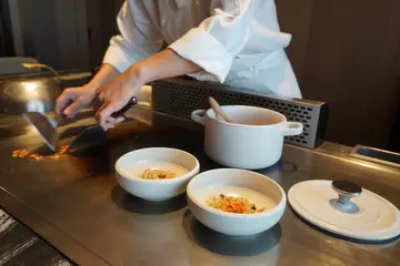 高雄漢來 焰.鐵板燒 | 高雄市前金區漢來大飯店45樓高雄指標性鐵板燒-高雄漢來 焰.鐵板燒燒改裝以來一直都非常受歡迎用全新的品牌更年輕化 ,位於漢來大飯店45樓 ,飽覽高雄港海洋音樂中心全環景景觀重新設計的菜單每個環節都充滿儀式感,大量使用台灣在地小農產品 ,提供一個完全與眾不同鐵板燒體驗~45樓電梯出來接待處 專屬於品牌入口但是進去後, 兩邊是分開營業 ,漢來 焰.鐵板燒除了有傳統的鐵板燒座位也提供了小型包廂就算約會也可以擁有自己完整的空間~現在很多新開的飯店樓層使用上比較擁擠但是傳統高級餐廳很注重門口Lounge 空間讓客人在入座前,有一個可以舒服等候的空間這次鐵板燒全新規劃方式以包箱為主進到門口區域是大桌區,同時可以容納兩位師傅為客人服務明亮的空間, 一望無際的海景絕對是高雄最頂級鐵板燒享受~如果是大家族或者是公司團體,可以容納16人最大的包廂擁有環景海景景觀,從高雄港展覽館延伸到海洋音樂中心一次飽覽 ,覺得會友與眾不同的聚餐體驗~我們預訂小包廂最多可以容納6位裝潢保留了經典的花窗,拍照拍起來很有古典風格,回想二十幾年前跟著家人入住漢來飯店陪著外公外婆吃了多次的漢來海港,一直到現在高雄海岸線改變了很多,變得更加漂亮更加現代這是改裝特別整個鐵板燒的桌子做個轉向讓客人擁有更好的景觀~日式懷石精神, 法式精緻感融入在鐵板燒中,鐵板燒桌的石材用的非常厚實,我很喜歡這個顏色多了一份沉穩感,卻不失現代美感風格,經過多年改裝,漢來飯店館內所有餐廳都經過重新更新繼續引領高雄頂級餐飲地位~可以選擇一般Flat water (Acqua Panna)或者是 氣泡水,S.Pellegrino 香檳般細緻的氣泡最適合佐餐享用儀式感就從擦手巾開始,現泡濕紙巾之前在很多懷石料理看過,蠻可愛的洛神花醃製苦瓜 l 洋蔥一開始聽到苦瓜其實有點怕想說怎麼會有這個東西XD不過口感有點出乎意料的清爽尾韻會有點苦,洋蔥隨時可以續加作為每道菜前過場很不錯~這次改裝使用的餐具都很有質感,完全就是為了這品牌量身訂做套餐為主用餐方式平日中午增加供應午間套餐其他時段供應精選套餐,今天我們點了精選套餐加上午間套餐但是不變的是, 兩個份量都超多第一道菜就看師傅搬出了小炭爐完全猜不出來要做什麼~松本茸茶湯 | 魚池紅茶 | 法式清湯原來是要現烤松本茸,站起來的松本茸有點可愛XD烤的方式突出姑香,最後稍微注入傳統法國清湯傳統法國清湯需要多種工序把雜質去除過程也不能有過多攪拌主廚特別加入了魚池紅茶作為混搭黃金湯頭帶茶香,品嘗起來不會太鹹很清香,展開今天美好開始開胃菜日本白蝦 | 台南白柚 | 胡蘿蔔慕斯胡蘿蔔慕斯口感柔軟日本白蝦爽脆口感很搭配容器非常可愛,不會像傳統鐵板燒這麼剛硬,我覺得是這次焰,讓人很耳目一新的地方米麵包清酒酒粕 | 油醋醬漢來烘培坊一向有很不錯的水準自己平時有時候都會特別買麵包來吃,米麵包是特別為餐廳特別製作已經詢問過, 是不會單獨販售清酒酒粕完全提升了麵包層次使用米來製作不會有負擔, 外酥內柔在料理前,師傅都會先展現當天新鮮食材精緻套餐 冷前菜海膽蒜香奶酪 | 水梨赤海膽現在鐵板燒要讓人驚艷,不管前菜主菜都要非常用心冷前菜特別創作出海膽奶酪,吃起來鹹甜沒腥味,有種歐式平衡的搭配,水梨清爽是不錯的陪襯午間套餐 | 冷前菜味噌起司片 | 鴨胸火腿 | 焦糖鴨肝布蕾午間套餐提供鴨肝布蕾口感濃厚煙燻過的鴨胸火腿,層次上很有法式餐酒感覺來到熱前菜部分今天提供的各種不同海鮮~為了符合色香味全鐵板燒體驗在烹調過程帶入了很多儀式感,這些儀式同樣有為菜色帶來全新感受,像是香料煙燻,直接炙燒百里香, 迷迭香等香草蓋上塔吉鍋蓋煙燻, 完全讓人耳目一新在打開蓋子前師傅特別請我們稍微往前來感受這個撲鼻而來的煙燻香氣~熱前菜南非海虎蝦 | 北海道生食級干貝 | 九孔鮑魚煙燻過後香料的香氣更突出卻沒有那種直接醃製會影響海鮮原味的問題來到湯品部分其中一份使用的小卷採用現場料理~美濃白玉蕪菁湯主廚特別去找了熟成廠商把澎湖小卷做成一夜乾在前面介紹時我還很懷疑, 小卷也可以?結論發現其實更有風味,底部蒸蛋跟濃稠湯頭完美融合~豆漿海鮮湯底 | 芋頭冬瓜加入豆漿的海鮮湯芋頭吃起來綿密本來覺得喝起來可能會很甜膩卻不是又是出乎意料的單品精緻套餐梨山高麗菜特別選用來自梨山的高麗菜高海拔種植出來的菜葉爽脆又夠甜鐵板煎完後, 加入高湯餵煮非常費工出乎意料加入起司粉還有松子看似簡單的一份青菜,除了爽脆外多了鮮甜,起司散發淡淡奶香個人很喜歡午間套餐蔬菜盤澎湖冰花 | 白灼鰻魚 | 洛神花午間套餐蔬菜盤用比較傳統方式提供不過加入了白灼鰻魚洛神花天然調味, 也有不錯的表現來到這邊其實也蠻飽的份量真完全不是開玩笑, 終於要進入主餐XD同樣先展現食材精緻套餐當日鮮魚 | 加納魚 (澎湖真鯛)精選套餐主餐前,還會先上道當日鮮魚,當天提供的是澎湖真鯛口感上扎實鮮甜~黑白木耳醋飲煙燻龍眼加入紅棗蠻有顆粒感也不會太酸去除口中味道,準備好迎接主餐的到來精緻套餐伊比利豬 | 帶骨豬里肌今天的主角(主餐)終於要登場很大膽使用伊比利豬的帶骨豬裡肌作為主餐排餐料理,里肌部分其實油脂較低,很考驗主廚料理能力除了傳統玫瑰鹽這次主廚T