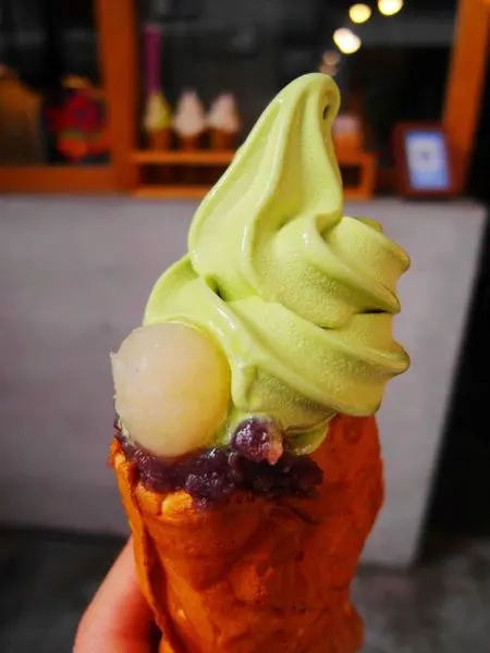 抹茶霜淇淋旁還有一顆白玉湯圓和紅豆泥搭配在一塊