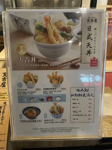 天吉屋也是日本東京人氣天丼之一!好吧~其實當時是要去朝聖金子半之助的,可是人潮真的太誇張!轉戰台北轉運站『天吉屋』 不得不說最近日本餐廳真的瘋狂進駐台灣!不過每一間店的人潮也是沒有減少過耶~我們原本當天是要去吃很火熱的金子半之助,但是人潮我們實在不敢恭維,只好轉戰台北轉運站的天吉屋!沒想到人潮也不少,但是沒有這麼誇張!礙於今天就是要吃到天丼的心,那就等吧天丼就是天婦羅蓋飯囉!由來比較有趣據說180年前,日本浅草有家天婦羅専門店將蝦子、白身魚和干貝的食材炸成炸物,後來成為受歡迎天丼。廢話完了,現場人也不少!對面的山頭火也挺多人的門口有立牌可以先參考參考當然在排隊的時候也會給予菜單話說這菜單也太有趣了吧?還可以這樣展開就對了話說店家很貼心地在等待的時候還會送上熱麥茶~圖文並茂,這些圖片看了我都餓了!有丼飯也可以點雙品,就是會多一碗烏龍麵今天我們要吃兩個 All star 丼!All Star 丼 $350加購套餐這些都是無限享用沒想到天吉屋還在日本榮獲丼飯大獎!店內空間比較壅擠一點店內也是提供熱麥茶哦!自由取用主餐還沒上來的時候沙拉倒是先來了~一碗沙拉這樣兩人分食,吃不夠再叫吧!不過人真的很多,所以沙拉只能多吃點了..先填點胃這就是很多日式料理使用的生菜醋醬囉!依照自己喜好添加,加太多就太膩了首先 All Star 雙品$380 上桌了烏龍麵比較普通一點~麵條雖然Q彈,不過麵條偏細吃完了會忘記的一種感受。就是普通完美的糖心蛋,嘿嘿嘿!其實整體炸物來說我們對炸蝦算是最滿意了~天使紅蝦果然不是蓋的~不會很小尾,吃起來也很彈牙的蝦,給推給推All Star 裡面包含了雞腿肉、五花肉、白身魚、透抽、地瓜、茄子、溫泉蛋這樣,挺豐富的就是貴了點不過不知道是不是炸物的師傅也不一樣的關係,有些脆度不錯也不油,有些炸物就偏油膩雞腿肉是先醃製過再油炸,也很好吃!不過就這樣被我吃下肚了~糖心蛋可以選擇攪再一起吃,或是單獨吃!這都是看個人喜好~我們倆都喜歡直接把蛋給吃掉天吉屋的白飯偏少,看過金子半之助的白飯挺多的!醬汁都跑到下面去囉,建議先攪拌一下,不然你會覺得很鹹這是小美的 All Star 井附上的味噌湯味噌湯的料還挺多的,不過這裡的味道比較偏淡,之前在台北吃吉豚屋那湯頭就稍微鹹了些日本來台開店的味噌湯口味有的會改良有的還是日式口味這樣今日帳單總結:價錢真的有點小貴,天丼整體不錯吃,控油部分要加強另外就是下次應該不會再吃雙品了,烏龍麵不得我們的心))查看更多