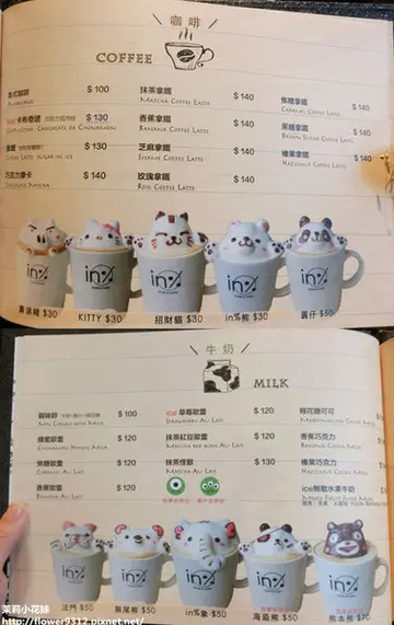 今天分享是一家複合型沙龍"In% Hair & Café"它是全台"首創"結合時尚沙龍與早午餐的~~也是藝人Lolipop成員小煜開的店~((就是棒棒糖男孩中的一員喔!我個人覺得很特別,雖然去過很多複合型餐廳這是我第一次來到沙龍型的複合型店家呢~^^~在經過時,真的覺得是一家很特別的店,到底是美髮還是下午茶呢~二話不說,進去就對了啦^^在等待位置區,有一個很大的變型金鋼,真的好高喔~ 但在店家也添加了一些風格整個店家,因著聖誕節的到來,很有氣氛呢~我很喜歡他的櫥窗擺設呢~((嘻嘻~我最喜歡聖誕節了啦!每一個位置都有不同的風格~~有可以看街景的用餐區~~還有一堆小熊包圍的用餐區~((很適合親子一起來呢~媽媽在樓上用髮,小朋友和爸爸在樓下吃下午茶當然也有2~4個姐妹,方便聊天的位置區呢~它的餐點非常的多種~~有"烤餅"、"早午餐"、"義大利餐"、"燉飯"、"下午茶",還有還有,可愛的"3D 拉花飲品"等。。。。他的餐點都可以升級為"A"、"B"二種~~A套餐(+80元):附飲品(120元以下)+今日甜點B套餐(+130元):附:沙拉+麵包+飲品 (120元以下)+今日甜點奶油泡菜豬肉燉飯:泡菜、豬肉他的燉飯味道抓的非常的剛好,在吃了第一口就感覺到泡菜淡淡的酸和辣~怎麼很開胃呢!而且裡面很滿多片泡菜和肉片的呢~肉片還滿大塊的~~這一款份量很適中剛好,很適合女孩子們吃呢~~((如果要吃燉飯,小花及朋友推薦這一道喔!!!韓式炸雞歐姆蛋:炸雞、法式吐司、歐姆蛋、薯條附餐三選一:薯條、雞塊、洋蔥圈飲品三選一:紅茶、奶茶、可爾必思 (套餐換飲料折抵NT$70)它是厚片的法式吐司,旁邊有蜂蜜,淋上去一起吃,感覺甜甜柔柔還滿好吃的呢~~((它的蜂蜜醬不會太甜它的薯條炸的非常的酥脆,感覺是有用大火下去炸,不會覺得有過多油膩的感覺~~單吃就可以吃出薯條的香氣呢~重頭戲就是"韓式炸雞"及"歐姆蛋"韓式炸雞個人覺得有一些偏硬~~~((哈哈,可能是我的牙口不好~但不得不說"歐姆蛋",真的很好吃呢~~吃起來很滑嫩,入口也超沽溜的啦!讓人會想要一口接著一口,超涮嘴的啦!讚啦!焦糖恐龍蛋:它一出場時,我朋友就說有像呢~~上面的爆米花,感覺真的很像恐龍蛋呢~~它有二個口味,一個是明治瑞士巧克力冰及明治草莓冰淇淋~~~上面的爆米花是焦糖爆米花,所以吃起來格外的有脆脆的感覺~~這一款就是草莓冰呢~~裡面可以看的到草莓的粒子,上面熱熱的鬆餅加上冰冰的冰淇淋真的是太好吃了他的鬆餅吃起來滿鬆的,不會太硬,而且份量滿多的,女孩子可以2~3個人吃一組呢~~整體口感甜而不膩,也是他們店家招牌甜點之一呢~~其實茉莉小花會選擇這一家餐廳,是被它的"3D 拉花"~~((壓軸!!壓軸!!這裡可以選擇自己喜歡的的咖啡或牛奶類的飲品,再選擇自己喜歡的3D拉花呢~~((自由配他的3D拉花也超多款的啦!不得不說,一上桌不忍的讓我小小的哇呼了一下~因為真的是太可愛了啦!整個少女的因子都跑出來~~讓我超捨不得喝的啦! 不得不說師父手好巧喔~怎麼可以做出這麼可愛的大象啦!玫瑰咖啡 + 大象拉花還有這麼可愛的無尾熊拉花呢~~((無尾熊拉花喝完會變成另一個小動物喔!看下去就知道焦糖咖啡 + 無尾熊拉花無論是大象拉花,還是無尾熊拉花,都讓我的手一直瘋狂的拍,不忍的一直和他合照呢~讓我內心充滿著少女情懷,不由自主地發出一聲,哇~怎麼會那麼的萌~無尾熊一喝到底,就變成小喵拉花了呢~~真是可愛…查看更多