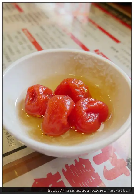 用紫蘇和桂花釀醃漬而成的蜜番茄~有著紫蘇特殊的香氣~吃起來甜滋滋的!!!非常的解膩又爽口!!!