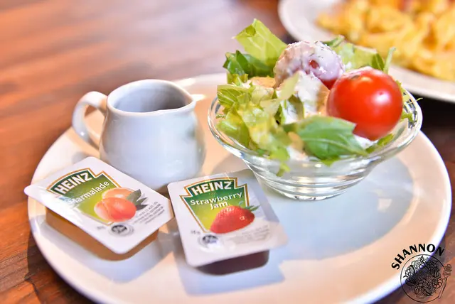 沙拉上方的醬不太清楚是甚麼(我忘記問)不過就有些像凱薩卻帶些起司香,是個好吃的沙拉盅(小小的),一旁還有楓糖和果醬(搭配吐司的)