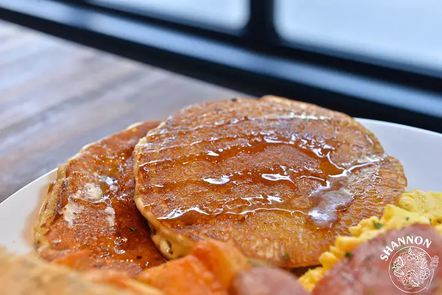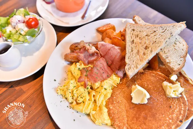 對於店家的Waffle滿意所以想說不知道Pancake會表現得如何呢?其實當天吃了後好像沒有這麼驚艷但是也不錯吃囉,吐司表現一般、歐姆雷炒得蠻香且還算軟嫩我喜歡、薯塊味道帶些香料氣息微微的酥口不錯、德式香腸S一直說是維也納香腸...雖然我也不知道是否正確但是就還OK吃、培根覺得可以在煎乾一些(我看老外好像超愛乾硬的),培根也最好搭著炒蛋吃比較不會鹹口!
