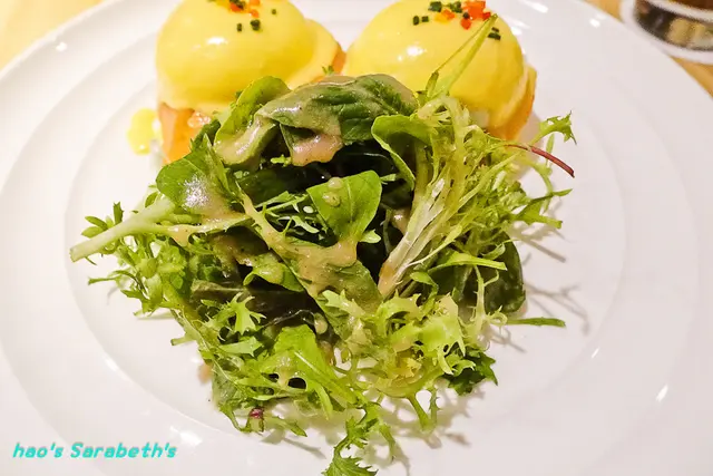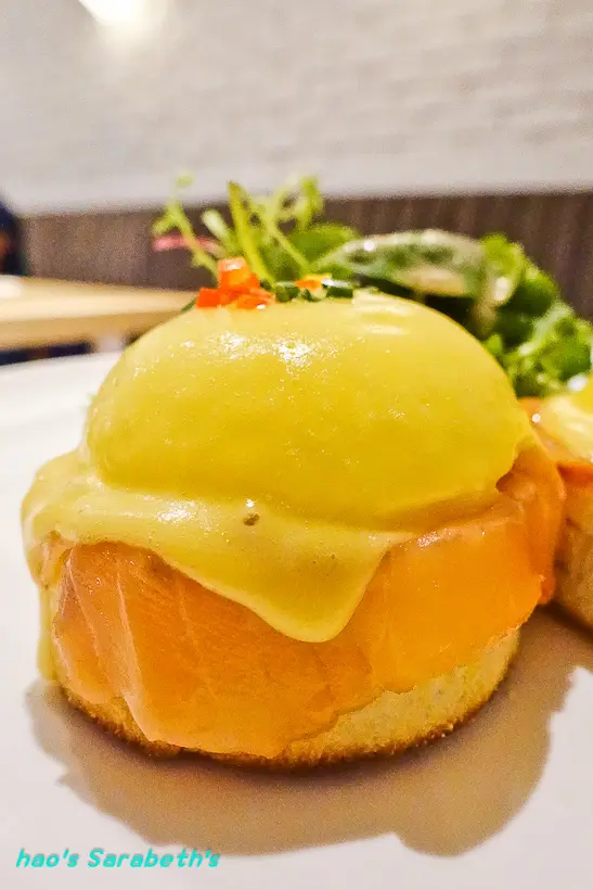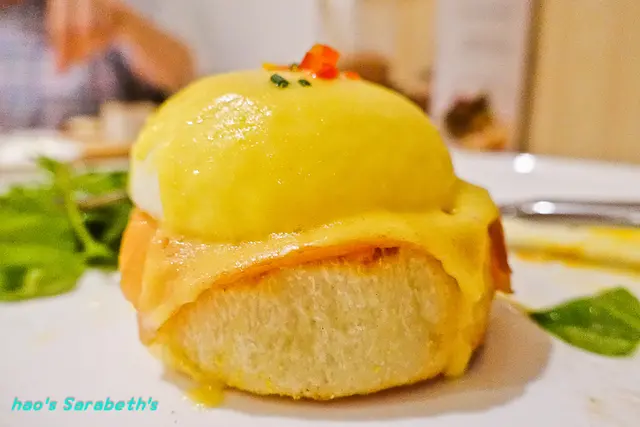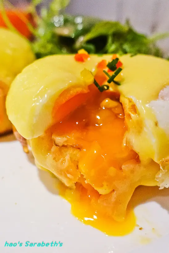 淋上濃黃荷蘭醬,綴飾以鮮綠細蔥及紅黃椒丁等,精巧美麗。