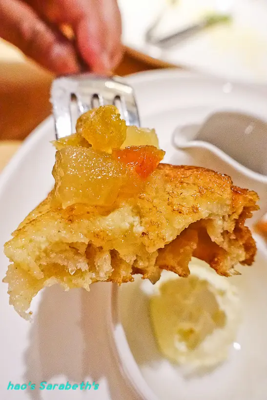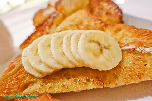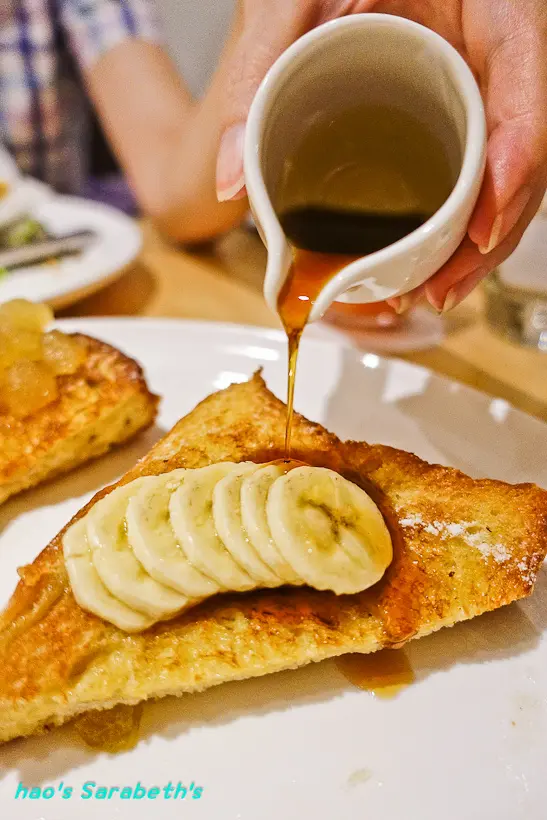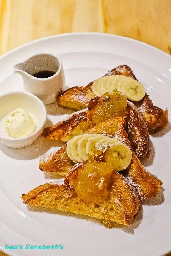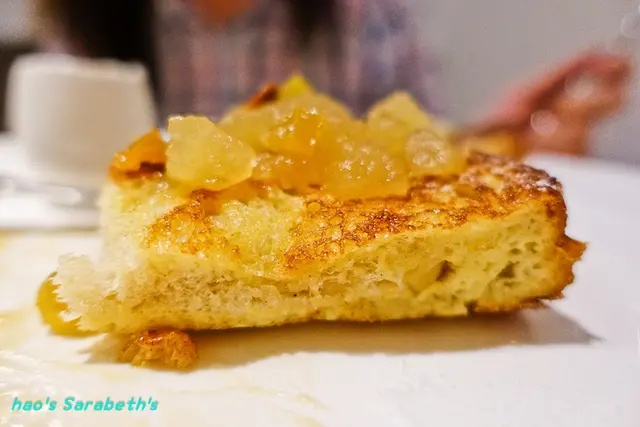 濃黃中雜著焦色,再灑上細密如雪般的糖粉,疊上新鮮的切片香蕉及蘋果肉桂果醬,
