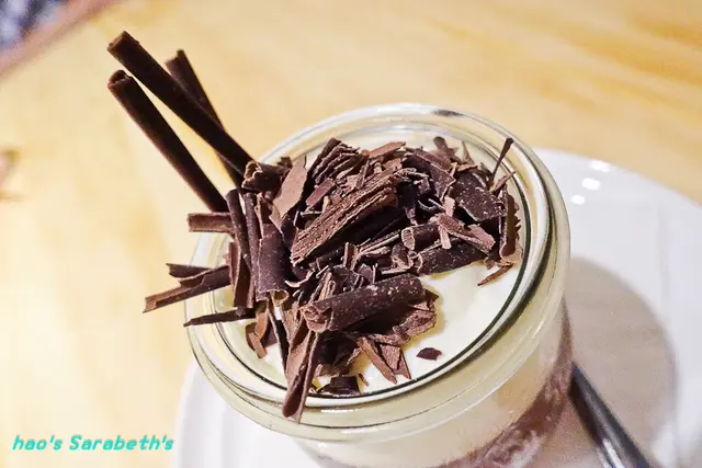 深褐襯著雪白,上層疊堆著層層巧克力屑。