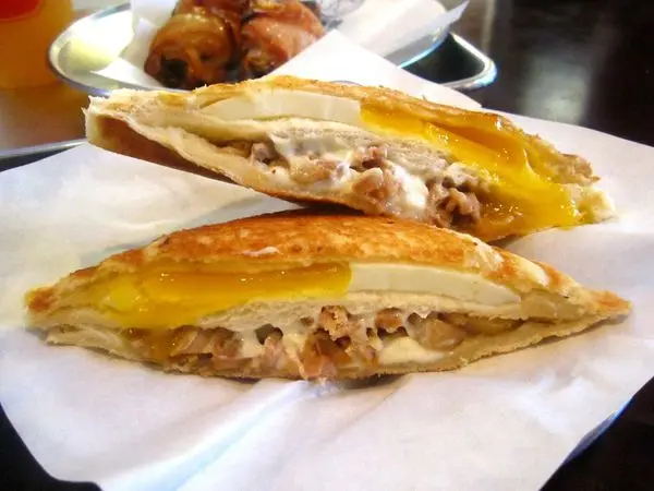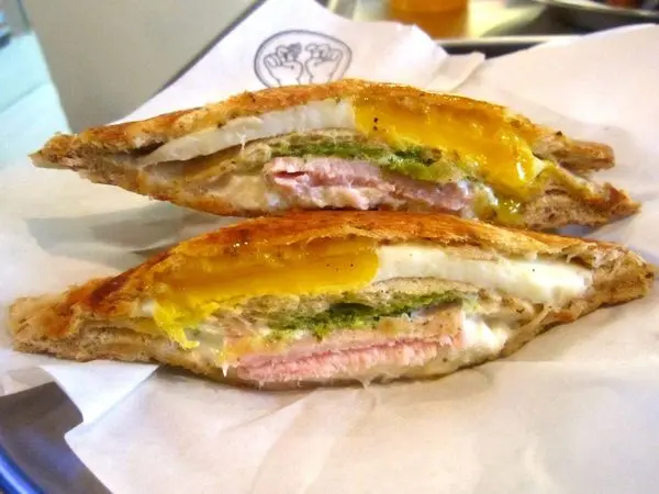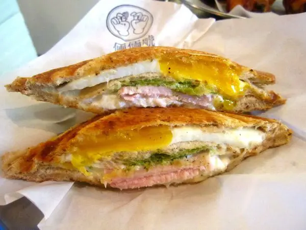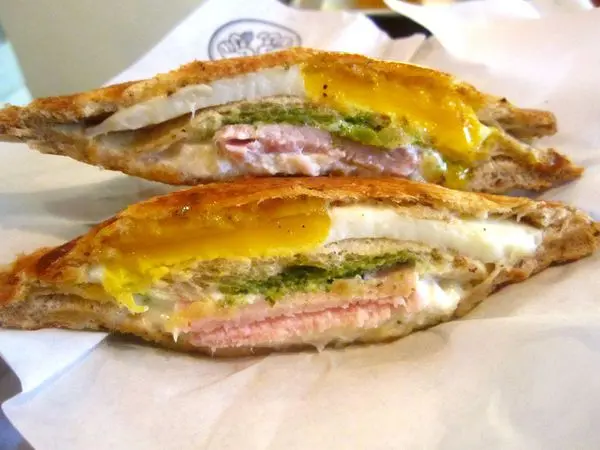 照燒雞乳酪蛋熱壓吐司是人氣NO.1,質地細緻的水牛乳酪趁熱吃是會牽絲的喔,