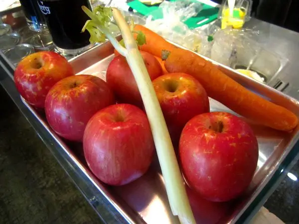 用蘋果、紅蘿蔔、芹菜做成的招牌綜合果汁,把蔬果洗乾淨之後,