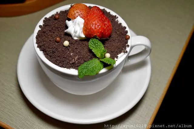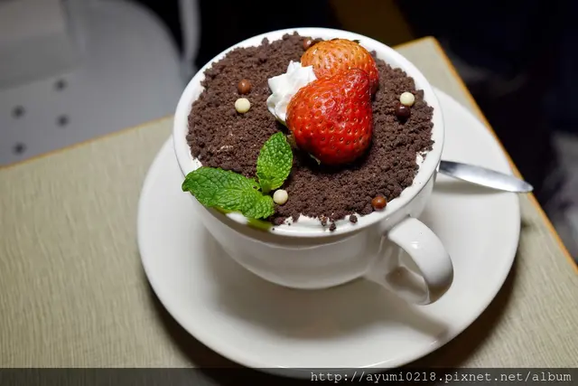 上頭巧克力碎片.中間的奶油.底下的咖啡