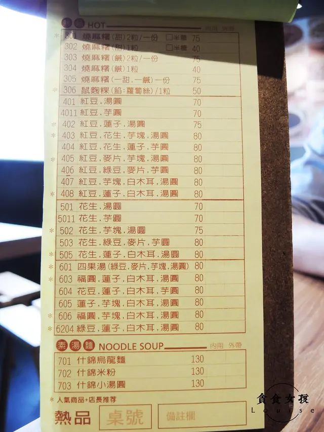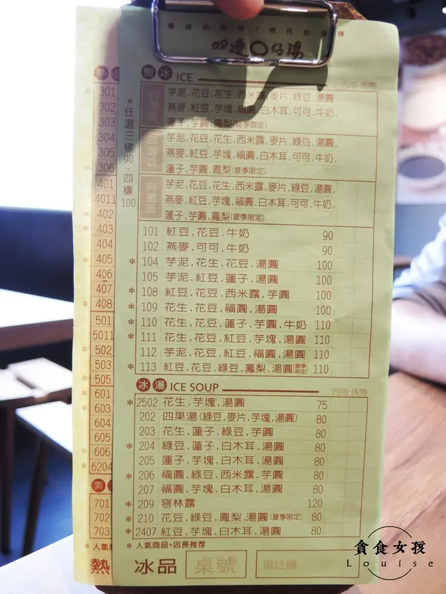雙連O仔湯的菜單有分兩頁,第一面是冷品(刨冰&冷湯)、第二頁是熱品(熱湯&麻糬&熱麵),價錢算中上,大多落在$80上下。一開始看到熱麵真的有嚇到>< 這不是甜點店嗎!? 已放入下次再訪名單,而這次露易絲主要要嚐試雙連O仔湯的湯圓!