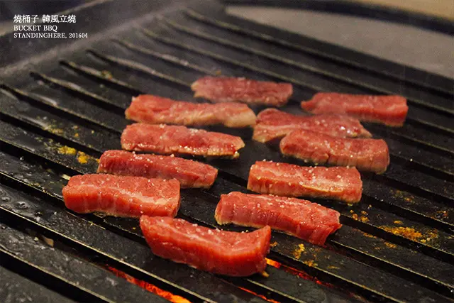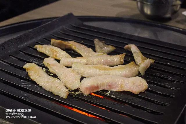 五花肉厚實且肥瘦均勻, 在烤盤上滋滋作響,