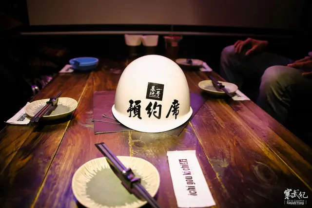 因為久久之前就訂好位了,所以桌上放了一大頂工地安全帽,上面大大的字寫著「預約席」,感覺超炫!