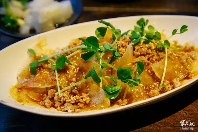 胡麻味增大根沙拉(160元): 薄如羽翼的大根在上面灑上白芝麻、肉末而胡麻味增滋味其實是頂不錯的適合配飯或下酒菜,一開始端上來還以為是大薄片,問店員後才知是大根,不禁佩服廚師的構想。味噌的香,胡麻的濃以及散上一點肉末的搭配,口味香濃,毫無油膩的一品!