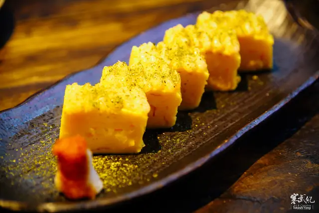 明太風玉子燒(120元):金黃色的玉子燒有著明太子的加持頓時讓玉子燒身價水漲船高,而純樸的蛋香像是被明太子的香氣給擁抱著,透過加上美奶滋與海苔粉後,更增加了玉子燒的美味,還有在一旁淋上了醬油的蘿蔔泥,也是非常棒的配搭。