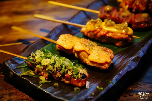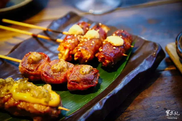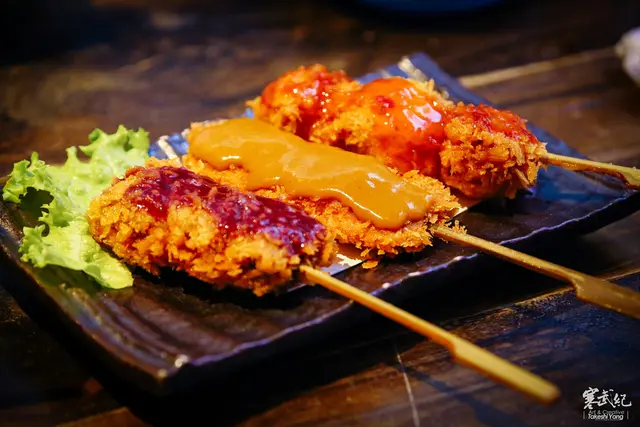 基地炸串盛合(290元):居酒屋少見的炸串燒,三串一組,挺創新的吃法和賣相。
